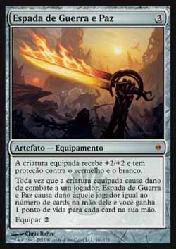 | Nome em Inglês: | Sword of War and Peace | | Nome em Português: | Espada de Guerra e Paz | | Custo de Mana: |  | | Tipo: | Artefato - Equipamento | | Texto: | A criatura Equipada ganha +2/+2 e tem Proteção contra o vermelho e contra o branco. Toda vez que a Criatura Equipada causar dano de combate a um jogador, Sword of War and Peace causa uma quantidade de pontos de dano àquele jogador igual ao número de cards em sua própria mão e você ganha 1 ponto de vida para cada card em sua mão. Equipar . | | Série: |  | | Raridade: | Mítico Raro | | Card: | 161 |