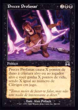 | Nome em Inglês: | Profane Prayers | | Nome em Português: | Preces Profanas | | Custo de Mana: |    | | Tipo: | Feitiço | | Texto: | Profane Prayers causa X pontos de dano à criatura ou ao jogador alvo e você ganha X pontos de vida, onde X é o número de Clérigos no Campo de Batalha. | | Série: |  | | Raridade: | Comum | | Card: | 162 |