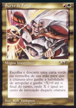 | Nome em Inglês: | Surge of Strength | | Nome em Português: | Surto de Força | | Custo de Mana: |   | | Tipo: | Mágica Instantânea | | Texto: | Como um custo adicional para Conjurar Surge of Strength, descarte um card vermelho ou verde. A criatura alvo tem Atropelar e ganha +X/+0 até o final do turno, onde X é seu Custo de Mana Convertido. | | Série: |  | | Raridade: | Incomum | | Card: | 163 |