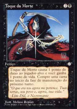 | Nome em Inglês: | Touch of Death | | Nome em Português: | Toque da Morte | | Custo de Mana: |   | | Tipo: | Feitiço | | Texto: | Touch of Death causa 1 ponto de dano ao jogador alvo. Você ganha 1 ponto de vida. Compre um card no início da Etapa de Manutenção do próximo turno. | | Série: |  | | Outras: | | | Raridade: | Comum | | Card: | 167 |