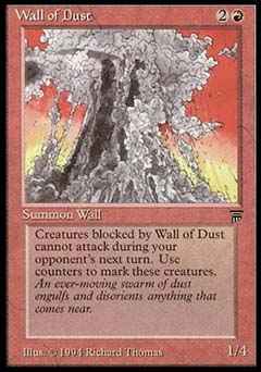 | Nome em Inglês: | Wall of Dust | | Nome em Português: | Sem nome em Português | | Custo de Mana: |   | | Tipo: | Criatura - Barreira | | Texto: | Defensor. Toda vez que Wall of Dust bloquear uma criatura, aquela criatura não pode atacar durante o próximo turno de seu controlador. | | P/T: | 1/4 | | Série: |  | | Outras: | | | Raridade: | Incomum | | Card: | 168 |
