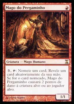 | Nome em Inglês: | Magus of the Scroll | | Nome em Português: | Mago do Pergaminho | | Custo de Mana: |  | | Tipo: | Criatura - Humano Mago | | Texto: | , : Nomeie um card. Revele um card aleatoriamente de sua mão. Se o card revelado for o card nomeado, Magus of the Scroll causa 2 pontos de dano à criatura ou ao jogador alvo. | | P/T: | 1/1 | | Série: |  | | Raridade: | Raro | | Card: | 169 |