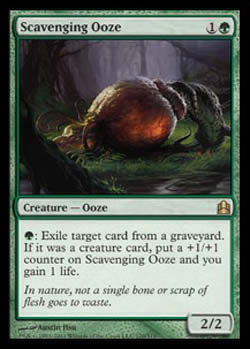 | Nome em Inglês: | Scavenging Ooze | | Nome em Português: | Sem nome em Português | | Custo de Mana: |   | | Tipo: | Criatura - Lodo | | Texto: | : Exile o card alvo de um cemitério. Se o card exilado for um card de criatura, coloque um marcador +1/+1 em Scavenging Ooze e você ganha 1 ponto de vida. | | P/T: | 2/2 | | Série: |  | | Outras: | | | Raridade: | Raro | | Card: | 170 |