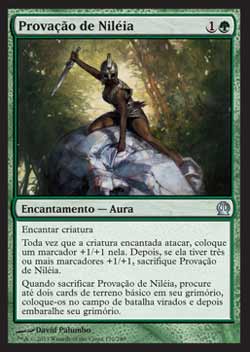| Texto: | Encantar criatura. Toda vez que a criatura encantada atacar, coloque um marcador +1/+1 nela. então if it tem três ou mais marcadores +1/+1 on it, sacrifice Ordeal of Nylea. Quando você sacrificar Ordeal of Nylea, procure em seu grimório por até dois cards de terreno básico, coloque-os no Campo de Batalha virados e então embaralhe seu grimório. |