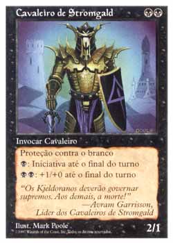 | Nome em Inglês: | Knight of Stromgald | | Nome em Português: | Cavaleiro de Stromgald | | Custo de Mana: |   | | Tipo: | Criatura - Humano Cavaleiro | | Texto: | Proteção contra o branco.