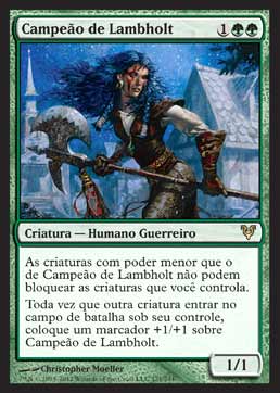 | Nome em Inglês: | Champion of Lambholt | | Nome em Português: | Campeão de Lambholt | | Custo de Mana: |    | | Tipo: | Criatura - Humano Guerreiro | | Texto: | As criaturas com poder menor que o poder de Champion of Lambholt's não podem bloquear as criaturas que você controla. Toda vez que outra criatura entrar no Campo de Batalha sob seu controle, coloque um marcador +1/+1 em Champion of Lambholt. | | P/T: | 1/1 | | Série: |  | | Raridade: | Raro | | Card: | 171 |