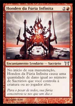 | Texto: | No início de sua Etapa de Manutenção, Honden of Infinite Rage causa à criatura alvo ou jogador alvo uma quantidade de pontos de dano igual ao número de Sacrários que você controla. Errata: na versão em português da série Campeões de Kamigawa, o texto ilustrativo deste card está incompleto. '... um dia o alimentaram.' é o trecho que completa a frase. |