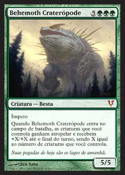 | Nome em Inglês: | Craterhoof Behemoth | | Nome em Português: | Behemoth Craterópode | | Custo de Mana: |     | | Tipo: | Criatura - Besta | | Texto: | Ímpeto. Quando Craterhoof Behemoth entrar no Campo de Batalha, as criaturas que você controla têm Atropelar e ganham +X/+X até o final do turno, onde X é o número de criaturas que você controla. | | P/T: | 5/5 | | Série: |  | | Raridade: | Mítico Raro | | Card: | 172 |