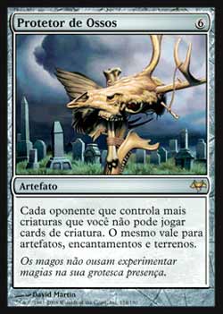 | Nome em Inglês: | Ward of Bones | | Nome em Português: | Protetor de Ossos | | Custo de Mana: |  | | Tipo: | Artefato | | Texto: | Cada oponente que controla mais criaturas que você não pode jogar cards de criatura. O mesmo se aplica para artefatos, encantamentos e terrenos. | | Série: |  | | Raridade: | Raro | | Card: | 174 |