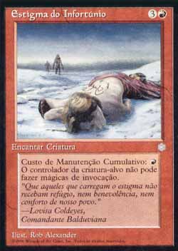 | Nome em Inglês: | Brand of Ill Omen | | Nome em Português: | Estigma do Infortúnio | | Custo de Mana: |   | | Tipo: | Encantamento - Aura | | Texto: | Encantar criatura. Manutenção Cumulativa . O controlador da criatura encantada não pode Conjurar mágicas de criatura. | | Série: |  | | Raridade: | Raro | | Card: | 177 |