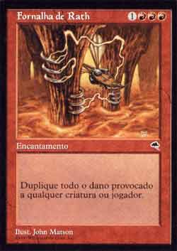 | Nome em Inglês: | Furnace of Rath | | Nome em Português: | Fornalha de Rath | | Custo de Mana: |     | | Tipo: | Encantamento | | Texto: | Se uma fonte fosse causar dano a uma criatura ou jogador, aquela fonte causa o dobro de dano àquela criatura ou jogador ao invés. | | Série: |  | | Outras: | | | Raridade: | Raro | | Card: | 177 |