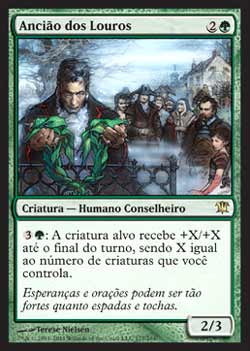 | Nome em Inglês: | Elder of Laurels | | Nome em Português: | Ancião dos Louros | | Custo de Mana: |   | | Tipo: | Criatura - Humano Conselheiro | | Texto: |  : A criatura alvo ganha +X/+X até o final do turno, onde X é o número de criaturas que você controla. | | P/T: | 2/3 | | Série: |  | | Raridade: | Raro | | Card: | 177 |