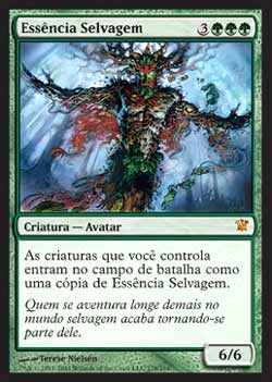 | Nome em Inglês: | Essence of the Wild | | Nome em Português: | Essência Selvagem | | Custo de Mana: |     | | Tipo: | Criatura - Avatar | | Texto: | As criaturas que você controla entram no Campo de Batalha como cópias de Essence of the Wild. | | P/T: | 6/6 | | Série: |  | | Raridade: | Mítico Raro | | Card: | 178 |