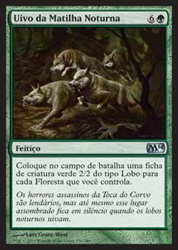 | Nome em Inglês: | Howl of the Night Pack | | Nome em Português: | Uivo da Matilha Noturna | | Custo de Mana: |   | | Tipo: | Feitiço | | Texto: | Coloque no Campo de Batalha uma ficha de criatura verde 2/2 do tipo Lobo para cada Floresta que você controla. | | Série: |  | | Outras: | | | Raridade: | Incomum | | Card: | 178 |