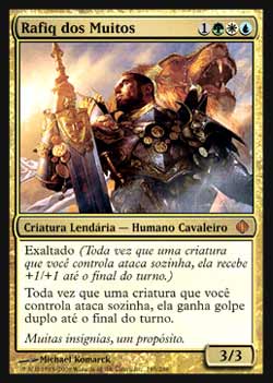 | Nome em Inglês: | Rafiq of the Many | | Nome em Português: | Rafiq dos Muitos | | Custo de Mana: |     | | Tipo: | Criatura Lendária - Humano Cavaleiro | | Texto: | Exaltado. Toda vez que uma criatura que você controla atacar sozinha, ela tem Golpe Duplo até o final do turno. | | P/T: | 3/3 | | Série: |  | | Outras: | | | Raridade: | Mítico Raro | | Card: | 185 |