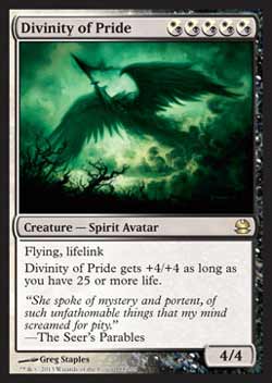 | Nome em Inglês: | Divinity of Pride | | Nome em Português: | Sem nome em Português | | Custo de Mana: |      | | Tipo: | Criatura - Espírito Avatar | | Texto: | Voar, Vínculo com a Vida. Divinity of Pride ganha +4/+4 enquanto você tiver 25 pontos de vida ou mais. | | P/T: | 4/4 | | Série: |  | | Outras: | | | Raridade: | Raro | | Card: | 188 |