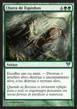 | Nome em Inglês: | Rain of Thorns | | Nome em Português: | Chuva de Espinhos | | Custo de Mana: |    | | Tipo: | Feitiço | | Texto: | Escolha uma ou mais - destrói o artefato alvo; destrói o encantamento alvo; e/ou destrói o terreno alvo. | | Série: |  | | Outras: | | | Raridade: | Incomum | | Card: | 190 |
