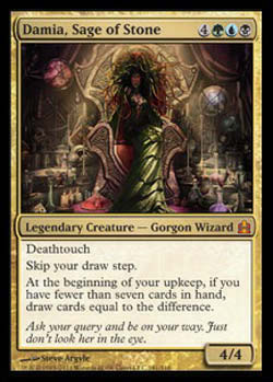| Nome em Inglês: | Damia, Sage of Stone | | Nome em Português: | Sem nome em Português | | Custo de Mana: |     | | Tipo: | Criatura Lendária - Górgona Mago | | Texto: | Toque Mortífero. Pule sua Etapa de Compra. No início de sua Etapa de Manutenção, se você tiver menos de sete cards na mão, compre uma quantidade de cards igual à diferença. | | P/T: | 4/4 | | Série: |  | | Raridade: | Mítico Raro | | Card: | 191 |