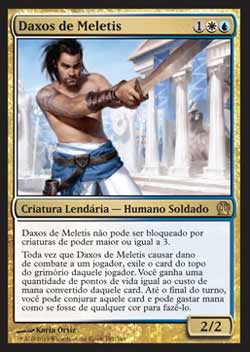 | Nome em Inglês: | Daxos of Meletis | | Nome em Português: | Daxos de Meletis | | Custo de Mana: |    | | Tipo: | Criatura Lendária - Humano Soldado | | Texto: | Daxos of Meletis não pode ser bloqueado por criaturas com poder 3 ou maior. Toda vez que Daxos of Meletis causar dano de combate a um jogador, Exile o card do topo do grimório daquele jogador. Você ganha uma quantidade de pontos de vida igual ao Custo de Mana Convertido daquele card. Até o final do turno, você pode Conjurar aquele card e você pode usar mana como se fosse mana de qualquer cor para Conjurar aquele card. | | P/T: | 2/2 | | Série: |  | | Raridade: | Raro | | Card: | 191 |