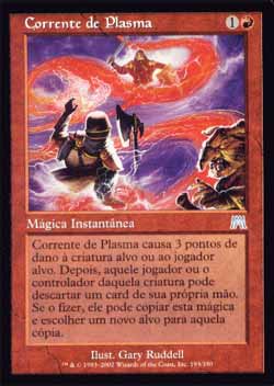 | Nome em Inglês: | Chain of Plasma | | Nome em Português: | Corrente de Plasma | | Custo de Mana: |   | | Tipo: | Mágica Instantânea | | Texto: | Chain of Plasma causa 3 pontos de dano à criatura ou ao jogador alvo. Então aquele jogador ou o controlador daquela criatura pode descartar um card. Se aquele jogador o fizer, ele pode copiar está mágica e escolher um novo alvo para aquela cópia. | | Série: |  | | Raridade: | Incomum | | Card: | 193 |