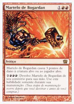 | Nome em Inglês: | Hammer of Bogardan | | Nome em Português: | Martelo de Bogardan | | Custo de Mana: |    | | Tipo: | Feitiço | | Texto: | Hammer of Bogardan causa 3 pontos de dano à criatura ou ao jogador alvo.