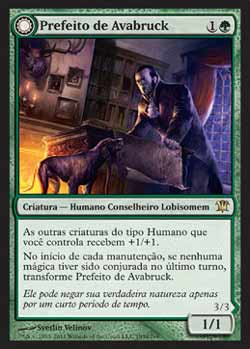 | Nome em Inglês: | Mayor of Avabruck | | Nome em Português: | Prefeito de Avabruck | | Custo de Mana: |   | | Tipo: | Criatura - Humano Conselheiro Lobisomem | | Texto: | As outras criaturas do tipo Humano que você controla ganham +1/+1. No início de cada Etapa de Manutenção, se nenhuma mágica tiver sido Conjurada no último turno, Transforme Mayor of Avabruck. | | P/T: | 1/1 | | Série: |  | | Raridade: | Raro | | Card: | 193a |
