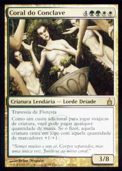 | Nome em Inglês: | Chorus of the Conclave | | Nome em Português: | Coral do Conclave | | Custo de Mana: |      | | Tipo: | Criatura Lendária - Dríade | | Texto: | Travessia de Floresta. Como um custo adicional para Conjurar mágicas de criatura, você pode pagar qualquer quantidade de mana. Se o fizer, aquela criatura entra no Campo de Batalha com aquela quantidade de marcadores +1/+1. | | P/T: | 3/8 | | Série: |  | | Outras: | | | Raridade: | Raro | | Card: | 195 |