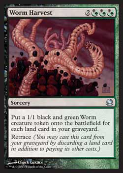 | Nome em Inglês: | Worm Harvest | | Nome em Português: | Sem nome em Português | | Custo de Mana: |     | | Tipo: | Feitiço | | Texto: | Coloque no Campo de Batalha uma ficha de criatura preta e verde 1/1 do tipo Verme para cada card de terreno em seu cemitério. Retraçar. Errata: a versão em português deste card indica que as fichas são de Vorme (Wurm), o que está errado. | | Série: |  | | Outras: | | | Raridade: | Incomum | | Card: | 195 |