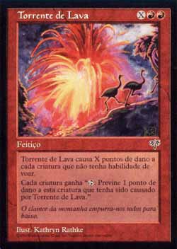 | Nome em Inglês: | Torrent of Lava | | Nome em Português: | Torrente de Lava | | Custo de Mana: |    | | Tipo: | Feitiço | | Texto: | Cada jogador pode virar qualquer número de criaturas desviradas que aquele jogador controla. Torrent of Lava causa X pontos de dano a cada criatura sem Voar que não tiver sido virada desta forma. Torrent of Lava causa X pontos de dano menos 1 a cada criatura sem Voar virada desta forma. | | Série: |  | | Raridade: | Raro | | Card: | 199 |