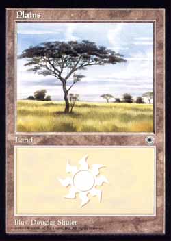 | Nome em Inglęs: | Plains | | Nome em Portuguęs: | Sem nome em Portuguęs | | Tipo: | Terreno Básico - Planície | | Texto: | : Adiciona a sua reserva de mana. | | Série: |  | | Outras: | | | Raridade: | Terreno Básico | | Card: | 199 |
