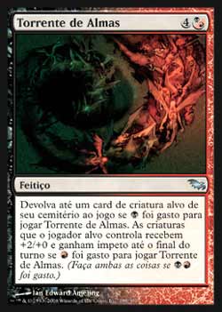 | Nome em Inglês: | Torrent of Souls | | Nome em Português: | Torrente de Almas | | Custo de Mana: |   | | Tipo: | Feitiço | | Texto: | Devolva até um card de criatura alvo de seu cemitério para o Campo de Batalha se foi gasto para Conjurar Torrent of Souls. As criaturas que o jogador alvo controla ganham +2/+0 e Ímpeto até o final do turno se foi gasto para Conjurar Torrent of Souls. (Faça ambos se  foi gasto.) | | Série: |  | | Outras: | | | Raridade: | Incomum | | Card: | 199 |