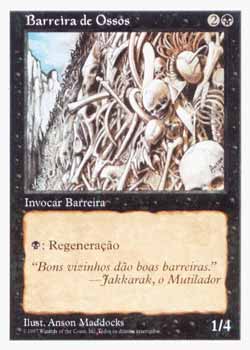| Nome em Inglês: | Wall of Bone | | Nome em Português: | Barreira de Ossos | | Custo de Mana: |   | | Tipo: | Criatura - Esqueleto Barreira | | Texto: | Defensor.