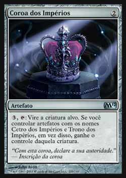 | Nome em Inglês: | Crown of Empires | | Nome em Português: | Coroa dos Impérios | | Custo de Mana: |  | | Tipo: | Artefato | | Texto: | , : Vire a criatura alvo. Ganhe o controle daquela criatura ao invés se você controlar Artefatos chamados Scepter of Empires e Throne of Empires. | | Série: |  | | Raridade: | Incomum | | Card: | 203 |
