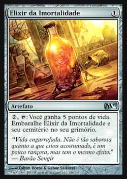 | Nome em Inglês: | Elixir of Immortality | | Nome em Português: | Elixir da Imortalidade | | Custo de Mana: |  | | Tipo: | Artefato | | Texto: | , : Você ganha 5 pontos de vida. Embaralhe Elixir of Immortality e seu cemitério em seu grimório. | | Série: |  | | Outras: | | | Raridade: | Incomum | | Card: | 206 |
