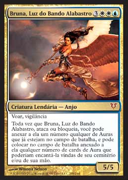 | Nome em Inglês: | Bruna, Light of Alabaster | | Nome em Português: | Bruna, Luz do Bando Alabastro | | Custo de Mana: |     | | Tipo: | Criatura Lendária - Anjo | | Texto: | Voar, Vigilância. Toda vez que Bruna, Light of Alabaster atacar ou bloquear, você pode anexar a ela qualquer número de Auras que estejam no Campo de Batalha e você pode colocar no Campo de Batalha anexadas a ela qualquer número de cards de Aura que possam encantá-la, de seu cemitério e/ou mão. | | P/T: | 5/5 | | Série: |  | | Raridade: | Mítico Raro | | Card: | 208 |