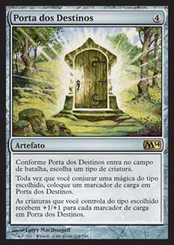 | Nome em Inglês: | Door of Destinies | | Nome em Português: | Porta dos Destinos | | Custo de Mana: |  | | Tipo: | Artefato | | Texto: | Conforme Door of Destinies entra no Campo de Batalha, escolha um tipo de criatura. Toda vez que você Conjurar uma mágica do tipo escolhido, coloque um marcador de carga em Door of Destinies. Criaturas que você controla do tipo escolhido ganham +1/+1 para cada marcador de carga em Door of Destinies. | | Série: |  | | Outras: | | | Raridade: | Raro | | Card: | 208 |