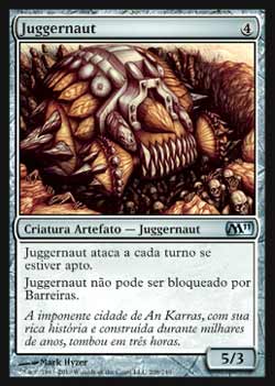 | Nome em Inglês: | Juggernaut | | Nome em Português: | Juggernaut | | Custo de Mana: |  | | Tipo: | Criatura Artefato - Juggernaut | | Texto: | Juggernaut ataca a cada turno se estiver apto. Juggernaut não pode ser bloqueado por Barreiras. | | P/T: | 5/3 | | Série: |  | | Outras: | | | Raridade: | Incomum | | Card: | 209 |