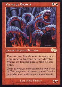 | Nome em Inglês: | Scoria Wurm | | Nome em Português: | Vorme de Escória | | Custo de Mana: |   | | Tipo: | Criatura - Vorme | | Texto: | No início de sua Etapa de Manutenção, lance uma moeda. Se você perder, devolva Scoria Wurm para a mão de seu dono. | | P/T: | 7/7 | | Série: |  | | Outras: | | | Raridade: | Raro | | Card: | 212 |