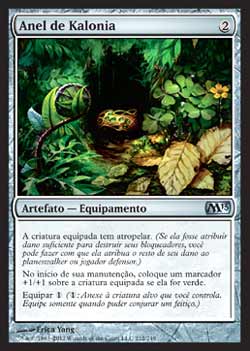 | Nome em Inglês: | Ring of Kalonia | | Nome em Português: | Anel de Kalonia | | Custo de Mana: |  | | Tipo: | Artefato - Equipamento | | Texto: | A criatura Equipada tem Atropelar. No início de sua Etapa de Manutenção, coloque um marcador +1/+1 na criatura Equipada se ela for verde. Equipar . | | Série: |  | | Raridade: | Incomum | | Card: | 212 |