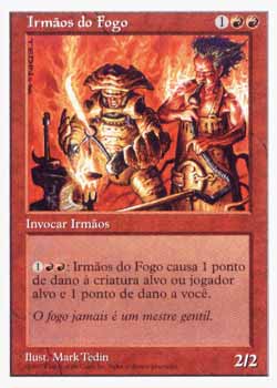 | Nome em Inglês: | Brothers of Fire | | Nome em Português: | Irmãos do Fogo | | Custo de Mana: |    | | Tipo: | Criatura - Humano Xamã | | Texto: |   : Brothers of Fire causa 1 ponto de dano à criatura ou ao jogador alvo e 1 ponto de dano a você. | | P/T: | 2/2 | | Série: |  | | Outras: | | | Raridade: | Comum | | Card: | 214 |