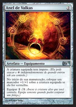 | Nome em Inglês: | Ring of Valkas | | Nome em Português: | Anel de Valkas | | Custo de Mana: |  | | Tipo: | Artefato - Equipamento | | Texto: | A criatura Equipada tem Ímpeto. No início de sua Etapa de Manutenção, coloque um marcador +1/+1 na criatura Equipada se ela for vermelha. Equipar . | | Série: |  | | Raridade: | Incomum | | Card: | 214 |