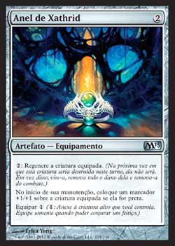 | Nome em Inglês: | Ring of Xathrid | | Nome em Português: | Anel de Xathrid | | Custo de Mana: |  | | Tipo: | Artefato - Equipamento | | Texto: | : Regenera a criatura Equipada. No início de sua Etapa de Manutenção, coloque um marcador +1/+1 na criatura Equipada se ela for preta. Equipar . | | Série: |  | | Raridade: | Incomum | | Card: | 215 |