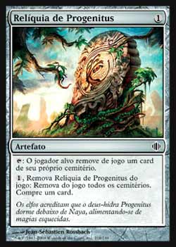 | Nome em Inglês: | Relic of Progenitus | | Nome em Português: | Relíquia de Progenitus | | Custo de Mana: |  | | Tipo: | Artefato | | Texto: | : O jogador alvo Exila um card de seu próprio cemitério.