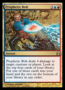 | Nome em Inglês: | Prophetic Bolt | | Nome em Português: | Sem nome em Português | | Custo de Mana: |    | | Tipo: | Mágica Instantânea | | Texto: | Prophetic Bolt causa 4 pontos de dano à criatura ou ao jogador alvo. Olhe os quatro cards do topo de seu grimório. Coloque um daqueles cards em sua mão e o restante no fundo de seu grimório em qualquer ordem. | | Série: |  | | Outras: | | | Raridade: | Raro | | Card: | 219 |