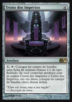 | Nome em Inglês: | Throne of Empires | | Nome em Português: | Trono dos Impérios | | Custo de Mana: |  | | Tipo: | Artefato | | Texto: | , : Coloque no Campo de Batalha uma ficha de criatura branca 1/1 do tipo Soldado. Coloque no Campo de Batalha cinco dessas fichas ao invés se você controlar artefatos chamados Crown of Empires e Scepter of Empires. | | Série: |  | | Raridade: | Raro | | Card: | 221 |