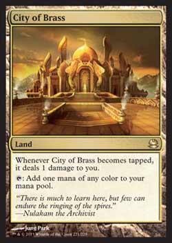 | Nome em Inglês: | City of Brass | | Nome em Português: | Sem nome em Português | | Tipo: | Terreno | | Texto: | Toda vez que City of Brass for virado, ele causa 1 ponto de dano a você.