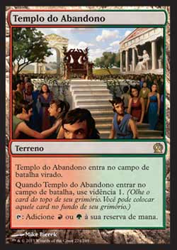 | Nome em Inglês: | Temple of Abandon | | Nome em Português: | Templo do Abandono | | Tipo: | Terreno | | Texto: | Temple of Abandon entra no Campo de Batalha virado. Quando Temple of Abandon entrar no Campo de Batalha, Vidência 1.