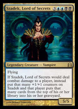 | Nome em Inglês: | Szadek, Lord of Secrets | | Nome em Português: | Sem nome em Português | | Custo de Mana: |      | | Tipo: | Criatura Lendária - Vampiro | | Texto: | Voar. Se Szadek, Lord of Secrets fosse causar dano de combate a um jogador, ao invés disso, coloque aquela quantidade de marcadores +1/+1 em Szadek, Lord of Secrets e aquele jogador coloca aquela quantidade de cards do topo do seu grimório em seu cemitério. | | P/T: | 5/5 | | Série: |  | | Outras: | | | Raridade: | Raro | | Card: | 228 |