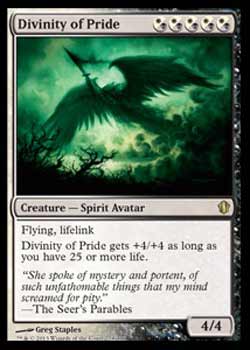 | Nome em Inglês: | Divinity of Pride | | Nome em Português: | Sem nome em Português | | Custo de Mana: |      | | Tipo: | Criatura - Espírito Avatar | | Texto: | Voar, Vínculo com a Vida. Divinity of Pride ganha +4/+4 enquanto você tiver 25 pontos de vida ou mais. | | P/T: | 4/4 | | Série: |  | | Outras: | | | Raridade: | Raro | | Card: | 228 |