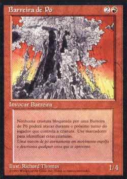 | Nome em Inglês: | Wall of Dust | | Nome em Português: | Barreira de Pó | | Custo de Mana: |   | | Tipo: | Criatura - Barreira | | Texto: | Defensor. Toda vez que Wall of Dust bloquear uma criatura, aquela criatura não pode atacar durante o próximo turno de seu controlador. | | P/T: | 1/4 | | Série: |  | | Outras: | | | Raridade: | Incomum | | Card: | 229 |
